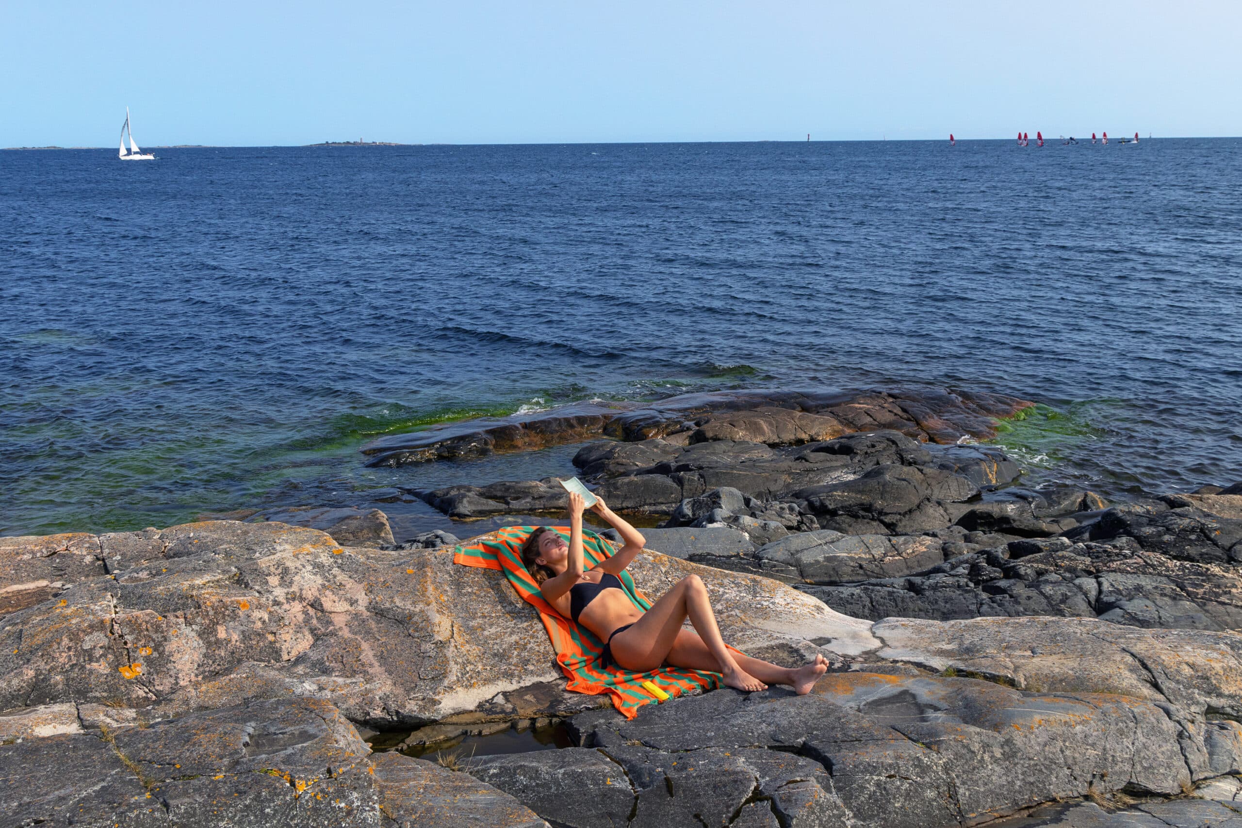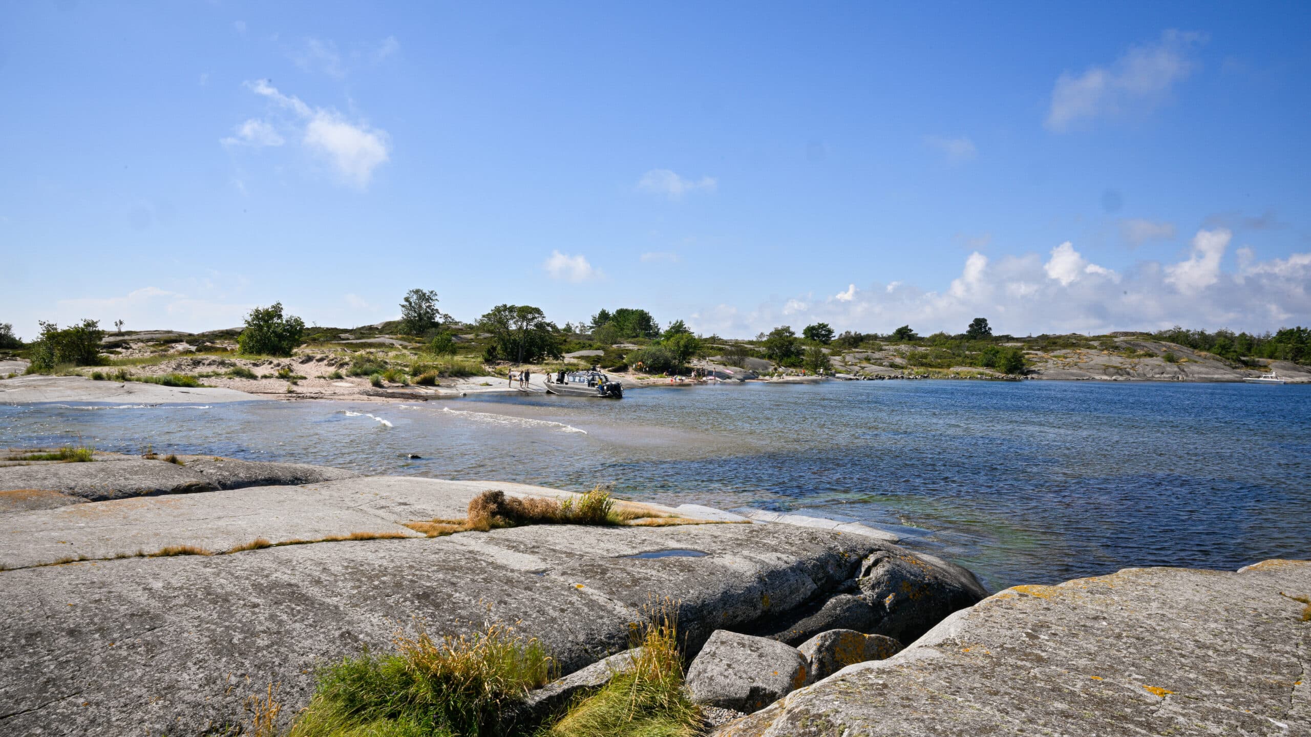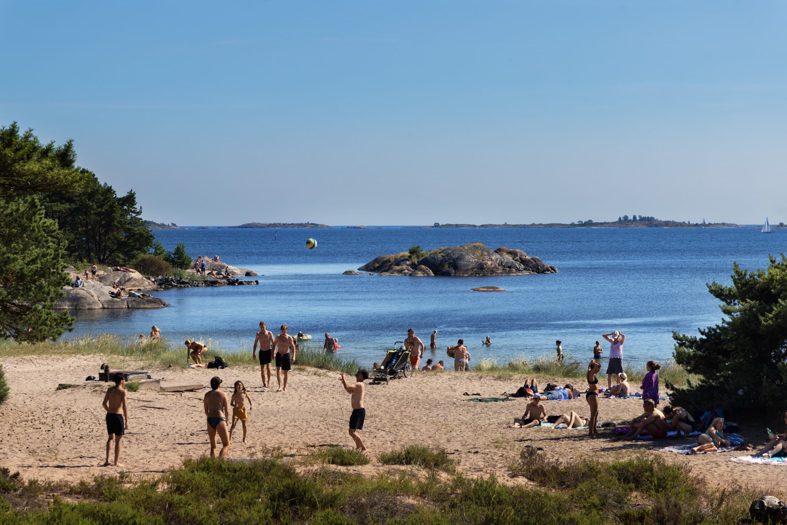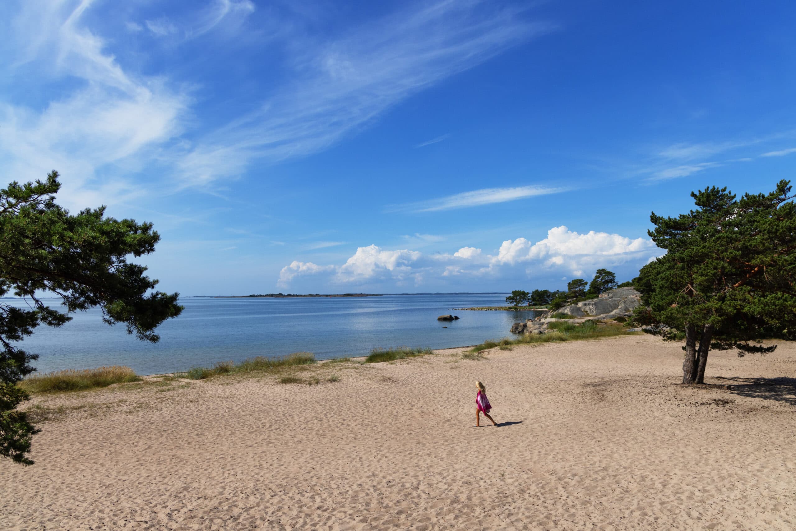Sandhamn erbjuder några av skärgårdens mest älskade badplatser – från mjuka sandstränder till varma, släta klipphällar. Trouville är öns ikoniska strand: vidsträckt, ljus och nästan sydländsk i känslan, bara en kort promenad genom tallskogen från hamnen. För ett snabbt morgon- eller kvällsdopp väntar Fläskberget i väster, medan Skärkarlshamn ligger bara några minuter från hotellet med utsikt över farleden.