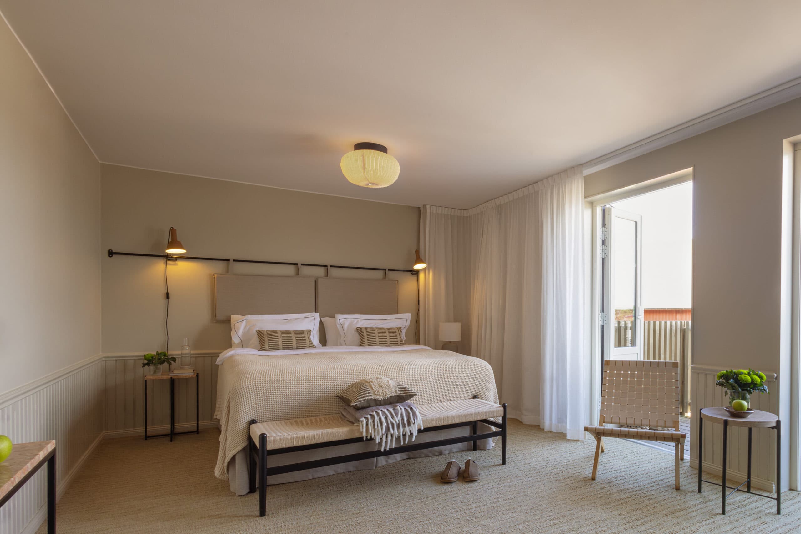 In our terrace rooms, you live in rooms decorated in a harmonious color scheme inspired by the nature that surrounds Sandön. All terrace rooms have their own furnished patio with easy access to the outdoor environment and surroundings. The rooms are also equipped with an ironing board, iron and hairdryer.