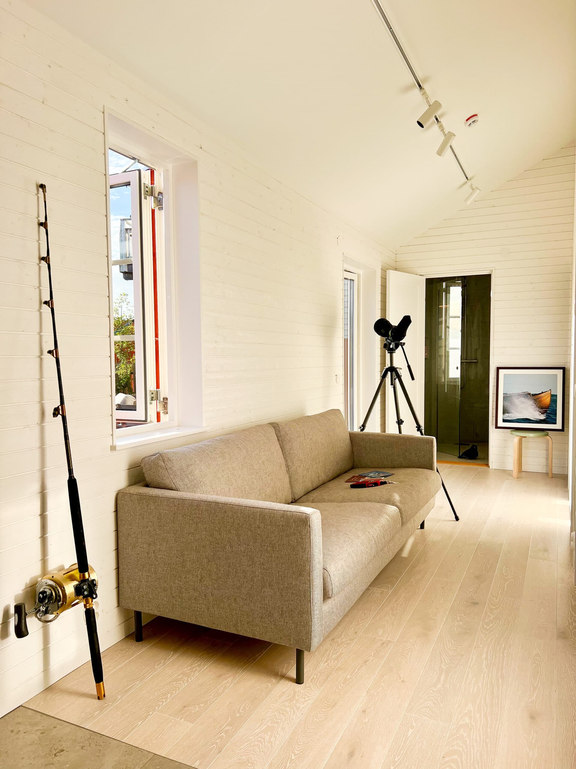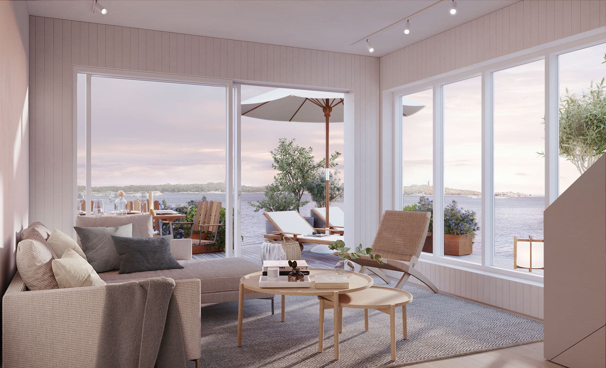 Interiören är ljus och harmonisk, med gedigna material och genomtänkt design. Stora fönster öppnar upp mot havet, hamnen eller tallskogen – alltid med naturen som närmaste granne.