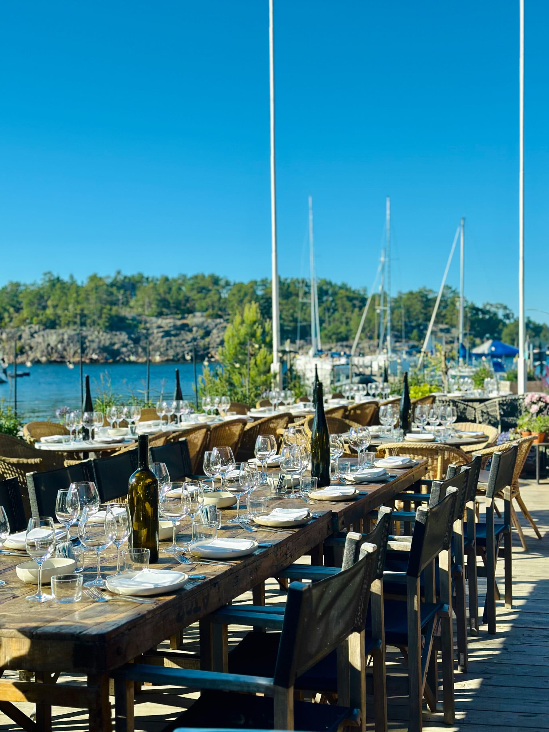 Välkommen till Bistron – hotellets hjärta och vardagsrum, där stämningen är lika avslappnad som utsikten är vacker. Här möts gäster, seglare och Sandhamnsbor över något gott att äta och dricka – från långa luncher i solen till sena sommarkvällar vid havet.